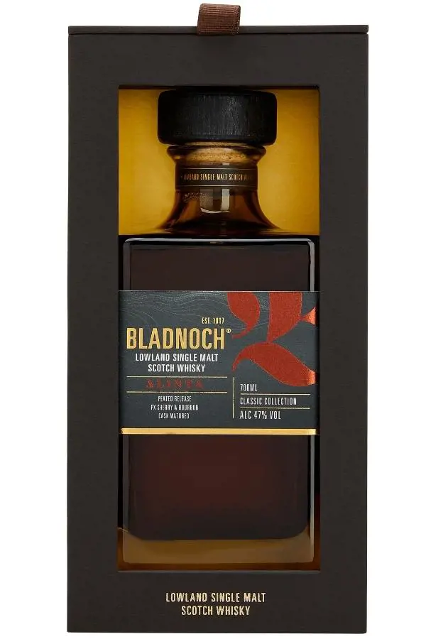 Alinta è una parola delle prime nazioni che significa fuoco o fiamma nella lingua tradizionale di diversi gruppi linguistici del sud e del sud-est dell’Australia. Bladnoch Alinta viene invecchiato in una combinazione di botti ex sherry Pedro Ximenez ed ex Bourbon per note dolci e di falò. Versione torbata con approssimativamente 55 ppm. Ne risulta un olfatto gelato affumicato, floreale con rovere dolce, mentre al palato presenta sentori che ricordano il fumo di falò, mandorle, uvetta con un corpo di cioccolato bianco.