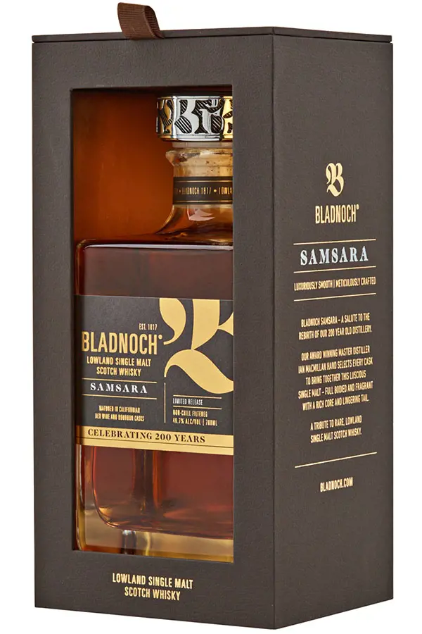 Vincitore della San Francisco Spirits Competition 2018 e del The Scotch Whisky Masters 2018, Bladnoch Whisky Samsara è un single malt whisky prodotto in casa Bladnoch. Samsara, che significa “rinascita” è un blend corposo e profumato di malti maturati in ex Bourbon ed ex vino rosso californiano. Ne deriva un whisky dal colore oro ramato, con note all’olfatto di crema alla vaniglia e sentori floreali con mele; anche al palato spicca la vaniglia ed erba floreale dolce. Bladnoch Whisky Samsara è ottimo se degustato puro oppure con un paio di gocce d'acqua sorgente.