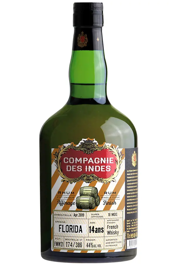 Compagnie des Indes Florida French Whisky Finish è un rum di 14 anni proveniente dalla Florida, maturato per altri 16 mesi in una botte di whisky francese. Questo rum ha aromi tostati e complessi di cioccolato, pepe rosa, carne secca affumicata. Ha una finitura liscia con un delizioso sapore di crema al cioccolato.