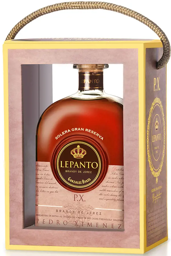 Lepanto Solera Gran Reserva P.X. È un brandy di origine spagnola, il quale prevede un invecchiamento di 15 anni: 12 anni in botti che hanno contenuto Tio Pepe e altri 3 anni in botti Pedro Ximenez (P.X.), che determinano il carattere morbido ed elegante di questo brandy. Dal colore ambrato intenso, Lepanto Solera Gran Riserva P.X. si distingue per una persistenza molto lunga, oltre che per i suoi aromi di uvetta e legni maturi, che conferiscono a questo brandy un gusto morbido ed elegante. Ideale da servire liscio, con ghiaccio o in abbinamento a formaggi stagionati.