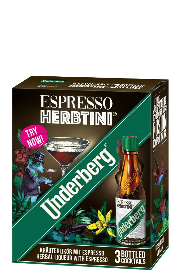 Dalla combinazione dell’originale Underberg, vodka, vaniglia e del caffè espresso 100% Arabica nasce Underberg Espresso Herbtini. Ispirato al leggendario cocktail cult "Espresso Martini" inventato a Londra a metà degli anni '80, Underberg Espresso Herbtini è il nuovo digestivo firmato Underberg. E’ privo di aromi e di coloranti aggiunti, senza kosher e glutine. Il caffè utilizzato è biologico, Master Blend 100% Arabica. Proprio come il classico, Underberg Espresso Herbtini è disponibile solo ed esclusivamente nell'iconica bottiglia monoporzione da 2cl. e ogni bottiglia è sigillata dall'originale capsula verde e coperta dalla cartapaglia di colore marrone scuro . Come per l'originale, ogni capsula può essere raccolta per ottenere premi esclusivi nel programma fedeltà "Tops & More".
